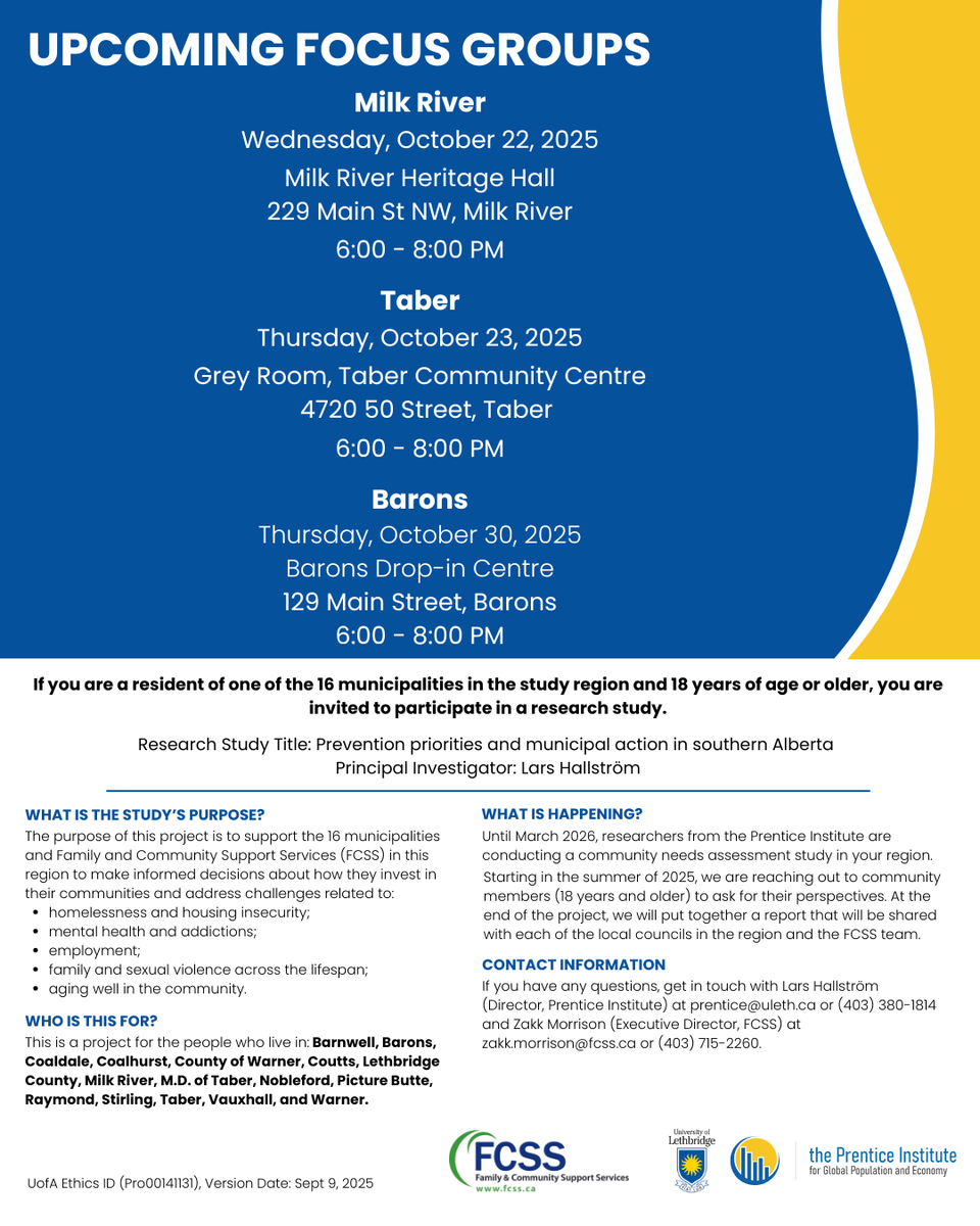 We are hosting three community group discussions to gather people’s perspectives on community assets, satisfaction with local services, and ideas for improvement. We will be writing a report to share with FCSS and local councils.